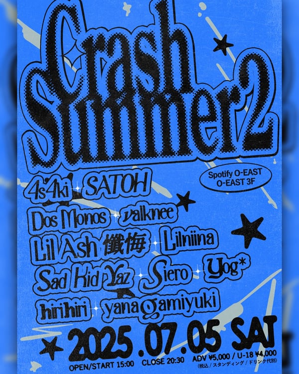 「Crash Summer」は、オルタナティブなヒップホップ / ラップやその周辺のカルチャーにフォーカスしたイベント。第2弾となる今回は、4s4ki、SATOH、Dos Monos、Lil Ash 懺悔、valknee、Lilniina、Sad Kid Yaz、Siero、Yog*、hirihiri、yanagamiyukiが出演者としてラインナップされており、後日追加アクトが発表される予定だ。イープラスではチケットの先行予約を受け付けている。