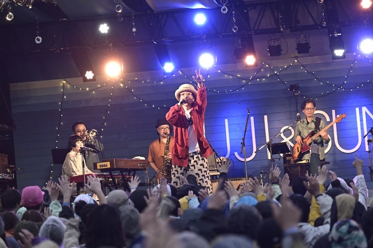 SUN STAGEのオープナーを務めたハンバート ハンバートは「長いこと待っていたんだ」「恋の顛末」「虎」など全12曲を歌唱。曲を跨いで話の内容が続く、ハンバートらしいほのぼのしたMCで観客を和ませつつ、佐野遊穂と佐藤良成は電気グルーヴ「富士山」のフレーズを「FUJI & SUN」に変更して、「フジアンドサーン! フジアンドサーン! 楽しい楽しい、フジアンドサーン!」と会場を盛り上げた。