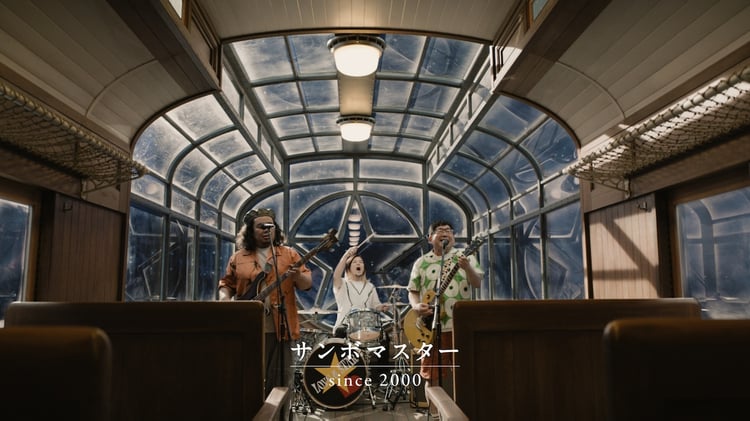 5月に放送スタートした、テレビCM「大人エレベーター」シリーズ第47弾に出演しているサンボマスター。夜空を駆ける列車を舞台に、CMのメインキャラクターである妻夫木聡と息の合った会話を繰り広げている。このたび公開された特別編では、メンバー3人がこのCMのために書き下ろした新曲「とまどうほどに照らしてくれ」を演奏するシーンが映し出されている。