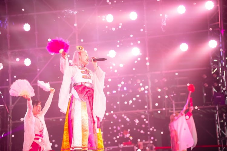 続く2曲目の「薄紅色の淡い夢の中で~バブルの呪文はAYATRA~」以降、前半戦は蕪木がメインボーカルを取るバンドスタイルで進行。1曲歌い終えた江夏はドラムセットの設置された舞台上手に収まり、5弦ベースを抱えた矢島およびサポートギタリストのノブは下手側に陣取った。翌桧ダンク冬雪と佐川ネル秋吉のパフォーマー陣はフロント両サイドを定位置に、ダンスのみならずMC進行や煽りで場を盛り上げ続け、蕪木はメインステージから花道、センターステージを縦横無尽に動き回りながら伸びやかなベルベットボイスを響かせていく。彼らに加え、派生ユニット・そのまんま祟りの2人(麻布美佳子、そら♨️るる)がバックダンサーとしてステージに華を添えたほか、楽曲によっては巫女姿のバックバックダンサーらも駆け付けて舞台上をにぎわせた。