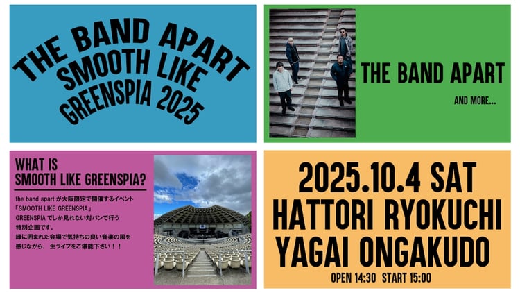 the band apart主催のイベント「SMOOTH LIKE GREENSPIA」が10月4日に大阪・服部緑地野外音楽堂で開催される。