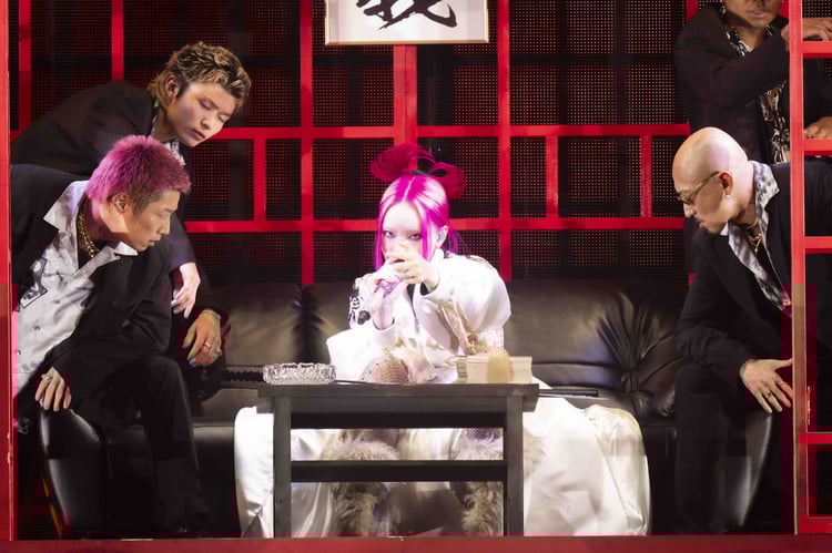 その後ちゃんみなは、極道の事務所風のセットで日本刀を片手に歌う「命日」や、ヒット曲「美人」などを披露。HANAを輩出した「No No Girls」プロジェクトのテーマソング「NG」では、地鳴りのような歓声とシンガロングが巻き起こった。本編ラストの新曲「WORK HARD」では、ランニングマシーンを計9台使用した演出でワークハードしているさまを表現。さらにワイヤーで逆さ吊りにされ、移動しながら歌うなど、ちゃんみなのパフォーマンススキルの高さを強く印象付けるステージが繰り広げられた。