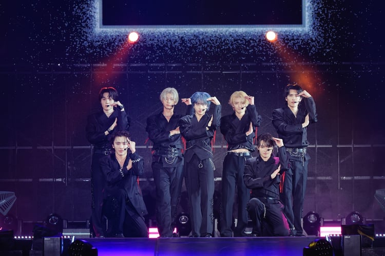 「Welcome back, Museum:0!」。声を合わせた7人がローブを一気に脱ぎ去ると、観測者たちは一斉に悲鳴のような声を上げる。燃えるような瞳で客席を見据える7人の表情がビジョンの額縁の中に映し出された「Museum:0」。彼らがまとうモノトーンのドレッシーなジャケットには天使の羽があしらわれ、それらは吹き荒ぶ風を受けて7人とともに激しく舞い踊った。ラウドなロックサウンドが疾走するこの曲で「壮絶なる最高傑作」の創造を誓ったのち、初披露となった「in the Fate」では大倉空人が「We are GNJB Brrrra!」と威勢よく名乗りを上げる。スパークラーとファイヤーボールの演出が熱狂を加速させたこの曲では、大倉、吉澤要人による“ラップ組”以外のメンバーもラップリレーを繰り広げ、アッパーなサウンドを乗りこなして会場全体の勢いをぐんぐんとドライブさせていく。