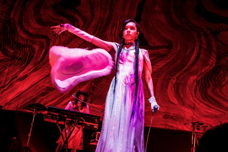 曲を終えたアヴちゃんが「どうもこんばんは、女王蜂です!」と挨拶して女優帽を脱ぎ捨てるのを合図に、「ヴィーナス」「ファウスト・改」とアッパーかつダンサブルなナンバーが次々と披露される。続く「メフィスト」ではやしちゃんと山口が鳴らす重低音が力強くホールを揺らし、切実さをダイレクトに訴えかけるようなバンドサウンドで観客を圧倒した。