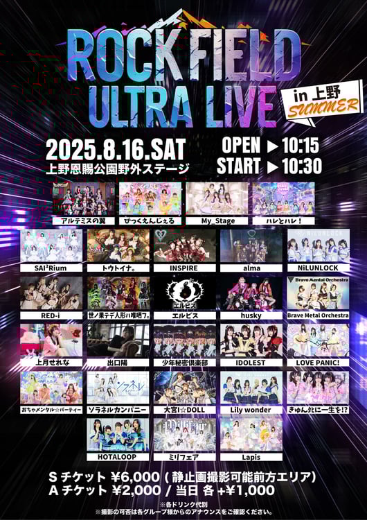 レコード会社・rock fieldの主催ライブ「rock field ULTRA LIVE in 上野 SUMMER」が8月16日に東京・上野恩賜公園野外ステージで開催される。