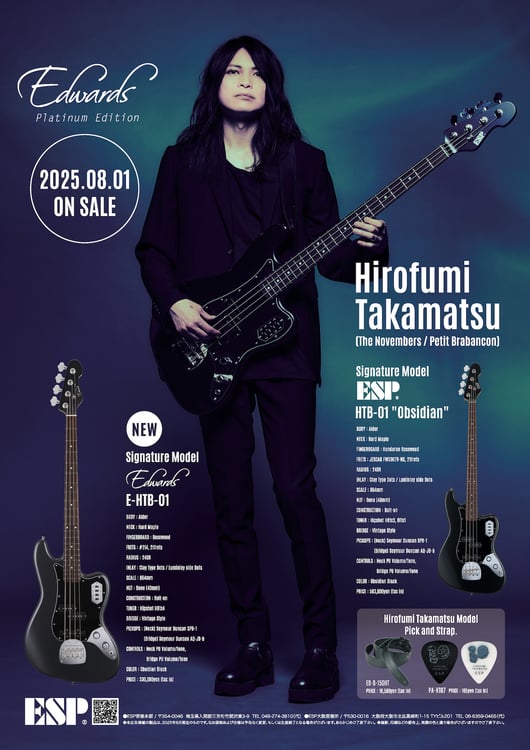楽器メーカーESPのEDWARDS Platinumより、高松浩史(The Novembers、Petit Brabancon)のシグネチュアモデルのベース「E-HTB-01」が本日8月1日にリリースされた。