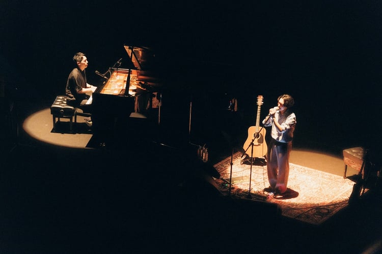 オーチャードホールでは1階から3階まで埋め尽くした観客たちが、期待を膨らませながら開演を待ちわびる。定刻過ぎ、下手と上手からBialystocksの2人が颯爽と姿を現すと、会場が大きな拍手に包まれた。そして菊池がグランドピアノの前に着席し、甫木元がマイクを手にしてすぐにライブがスタート。ジャズをルーツに持つ菊池の優雅かつダイナミックなピアノと、甫木元の柔らかくソウルフルな歌声が融合し、ホールがみるみるうちに彼らの色に染まった。シンプルな編成だからこそ2人のミュージシャンとしての力量と楽曲の個性が際立つ。複雑なリズムやメロディが見事に奏でられると、客席から喝采が沸き起こった。