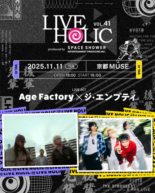「LIVE HOLIC」はスペースシャワーエンタテインメントプロデューシングが主催・企画するツーマンライブシリーズ。“先輩バンドと後輩バンドによる、初顔合わせの最強ガチンコ2マン”というコンセプトのもと、さまざまなバンドがツーマンライブを披露してきた。41回目の開催となる今回は、Age Factoryとジ・エンプティの2組が出演。京都で熱演を繰り広げる。イベントオフィシャルサイトではチケットの1次先行予約を受付中。