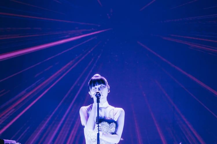 この日のライブで特に観客の度肝を抜いたのは、その映像演出だ。ステージとフロアの間に紗幕を垂らして映像を投影する手法は、すでに10年ほど前から一般的になっていて珍しくないが、今回使用されたのは、フロアからその存在がほとんど認識できないほど透明度の高い特殊な幕。そのため観客は、まるで目の前に模様が飛び出して浮かんでいるかのような、かつてないほどの立体感のある映像を体験することになった。またカラフルなライトがメンバーの体のみを照らし出し、まるで彼ら自身が発光しているかのような幻想的な光景を生み出していた。