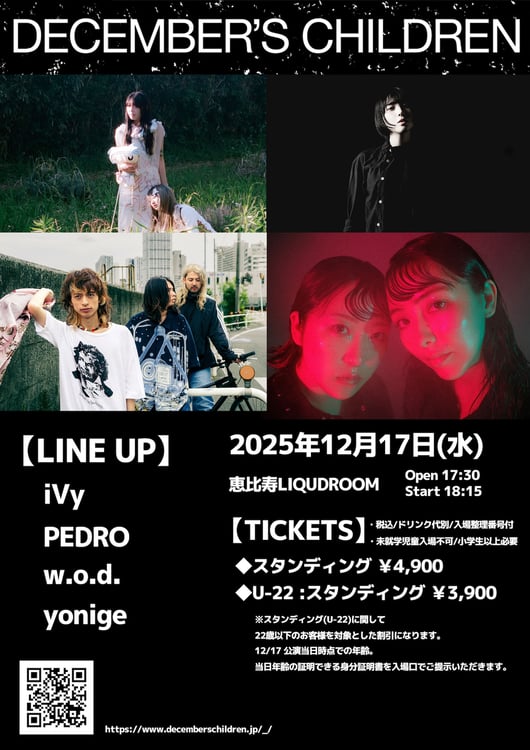 「DECEMBER'S CHILDREN」は2012年から例年12月に行われているライブイベント。昨年は初の大阪開催となったが、今年は再び東京に舞台を移す。出演者はiVy、PEDRO、w.o.d.、yonigeの4組。イープラスでは本日8月29日18:00にチケットの先行予約受付がスタートした。