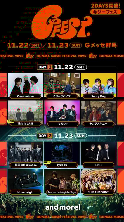 「GFEST」は“音楽のある街”をキャッチコピーに掲げる群馬を舞台に、群馬の“G”、グルメの“G”、グッズの“G”など、さまざまな“G”が楽しめるフェスとして、スペースシャワーエンタテインメントプロデューシングが企画するイベント。今回の発表で11月22日にThis is LAST、23日にsyudouがラインナップに追加された。イベントのオフィシャルサイトでは9月15日までチケットの第3次先行抽選予約を受け付けている。