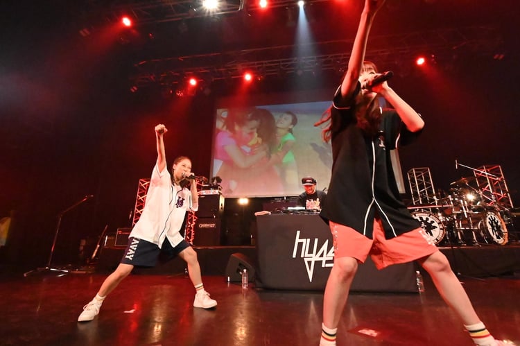 バックDJにプロハンバーガーを従えて、いよいよhy4_4yhが登場。「hy4_4yhは40年後もやめへんで!」というyukarinの宣言を合図に「Keep Running」でライブをスタートさせ、「K.U.N.F.U」や、童子-Tの曲にフィーチャリングで参加した「HOLE!」などの曲で会場をヒートアップさせていく。