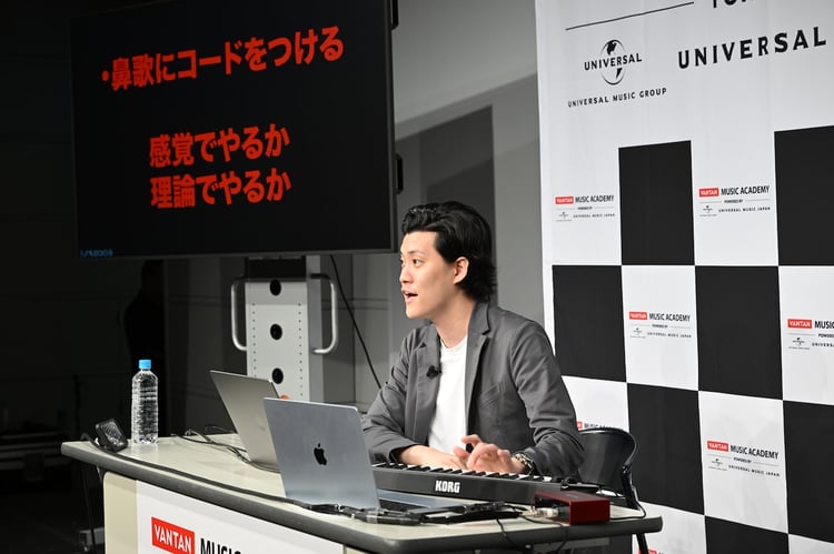 質疑応答では、学生からの「⾃分で作曲すると好きなアーティストに似てしまう」という相談に対し、「そのアーティストからかけ離れた特徴をかけ合わせられれば、それが君の個性になる」と回答。また「活躍するためのアドバイスがほしい」との声には「尊敬している⼈を抜かすために、誰よりも努⼒することが⼤事」と、“行動し続けること”の重要性を伝えた。