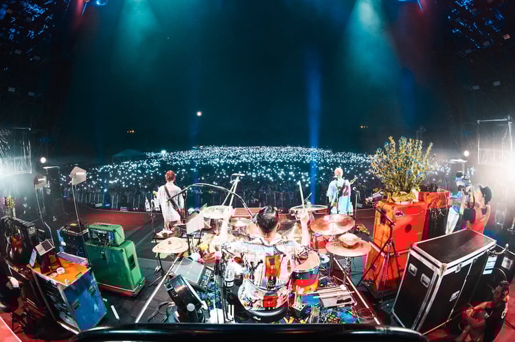大トリに登場したWANIMAのステージは、夜空を切り裂くような轟音とともに「Do Gang」で幕開け。アバンギャルドなメロディと熊本弁を用いた歌が会場を突き抜け、2万5000人の心と体を一斉に揺らす。KO-SHIN(G, Cho)は体脂肪率6%まで絞り上げた肉体でギターをかき鳴らし、鋭いフレーズで観客の視線を釘付けにした。KENTA(Vo, B)が「FUJIくん! ナイスなビートちょうだい!」と叫ぶと、FUJI(Dr, Cho)が強靭なリズムで応え、「Rolling Days」の演奏へ。青空とさわやかな旋律がマッチし、観客は野外フェスならではの体験を堪能した。ここで“へいへい”こと宗本康兵(Key)が加わり、WANIMAは最新EP「Off-Leash」から「トビウオ」をパフォーマンス。激しさの奥にアンニュイな歌謡の影を潜ませた新境地のサウンドが会場に響き渡る。続く「存在」では、KENTAが「俺はばあちゃんに向けて歌うけん。みんなは大切な人を思い浮かべて聴いてほしいです」と語り、観客はそれぞれの“かけがえのない人”を思い浮かべながら、静かな感動に浸った。