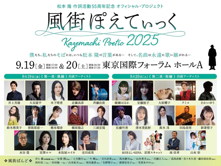 「風街ぽえてぃっく2025」は、松本隆の作詞活動55周年を記念したコンサート。“松本隆の数々の名曲を歌い継ぐ”をコンセプトに、初日は「第一夜:風編」、2日目は「第二夜:街編」と題して行われる。今回の発表で初日に松本からの提供楽曲も多い水谷豊、2日目に2010年発表のコンピレーションアルバム「松本隆に捧ぐ -風街DNA-」に参加し、今回が初のコンサート出演となる綾瀬はるかの登場が決定。さらに予定演奏曲として初日に「あなたを・もっと・知りたくて」「すこしだけ やさしく」「やさしさ紙芝居」「ルビーの指環」、2日目に「赤いスイートピー」「瞳はダイアモンド」が新たに追加された。