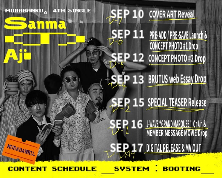 MURABANKU。は、ネギシ(Tp)、土屋慈人(G)、丸山滉貴(B)、シンジ(Key)、チェ・ノブト(SP)の5人組インストゥルメンタルバンド。7月に開催された「FUJI ROCK FESTIVAL '25」の登竜門ステージ 「ROOKIE A GO-GO」に出演したほか、アニメ「CITY THE ANIMATION」の劇中曲を手がけるなどして話題を集めている。