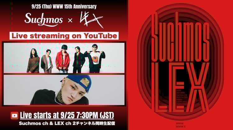 9月25日に東京・WWW Xで行われるSuchmosとLEXのツーマンライブ「WWW 15th Anniversary『Suchmos × LEX』」の模様が、2組のYouTube公式チャンネルで生配信される。