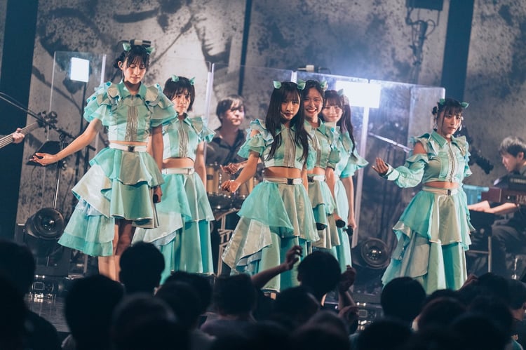 塩崎が「緊張しすぎて、イヤモニを40分前から付けてました」と話し、矢吹がヘアメイクに2時間近くかけたことを明かした通り、でび楽団の音圧やライブのプレッシャーにのまれないよう、いつも以上の気合いを携えてステージに立った6人。その後も彼女たちはテクニカルな演奏によって紡がれる強靭で緻密なアンサンブルや、楽曲の世界観に合わせて表情を変える照明演出と一体となり、渾身のパフォーマンスを繰り広げていく。「ミッドナイトドライブ」では音源にも入っているサックスの音色が鮮やかな彩りをもたらし、ヤマモトショウ提供のシティポップナンバー「DCB」では楽曲の持つグルーヴが増大。壮大な音像が特徴の「STARLIGHT CIRCUS」はコーラスやストリングスのアレンジにより、さらなる破壊力を伴った。