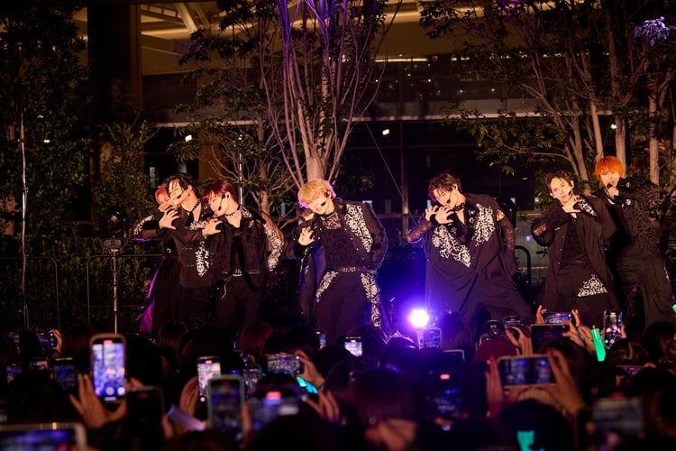 秋めいた涼やかな夜風が吹き抜ける、駅前の野外ステージ。観覧エリアを埋め尽くす8号車の大歓声に迎えられた超特急の9人は、アッパーなダンスナンバー「Steal a Kiss」でミニライブをスタートさせた。漆黒の布をたっぷりと使い、猫の尻尾を思わせるファーもあしらった「NINE LIVES」の新衣装を艶やかに揺らめかせながら、シャープなダンスでファンを挑発する9人。ラストサビでセリフパートを担うユーキは「好きなんだろ?」を「好きだニャン♡」と“NINE LIVES仕様”にアレンジしたキラーフレーズで、8号車たちの黄色い悲鳴を一身に集めた。