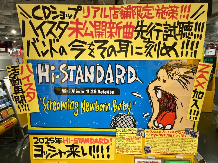 なお東京・タワーレコード渋谷店のポップには「CDショップリアル店舗限定施策!!! ハイスタ未公開新曲先行試聴!!! バンドの今をその耳に刻め!!!!」「ハイスタ活動再開!!!! ZAX加入!!!」「2025年Hi-STANDARD! ヨッシャ来い!!!!」と、勢いのあるメッセージが掲げられている。フライヤーが数量限定で配布されているので、足を運んだ際にはチェックしておこう。