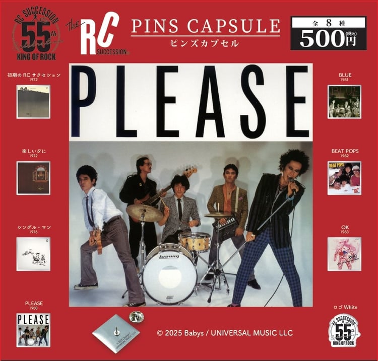 カプセルトイは「初期のRCサクセション」「楽しい夕に」「シングル・マン」「PLEASE」「BLUE」「BEAT POPS」「OK」「55周年ロゴ WHITE」の計8つのデザインのピンズが入ったVOL.1と、「RHAPSODY」「FEEL SO BAD」「HEART ACE」「MARVY」「COVERS」「Baby a Go Go」「55周年ロゴ BLACK」の計7つのデザインのピンズが入ったVOL.2の計2企画で、それぞれ価格は1回500円。東京・UNIVERSAL MUSIC STORE HARAJUKUで10月15日~10月26日に開催される「RCサクセション&忌野清志郎 55th Celebration POP-UP STORE」、全国のHMV、gashacoco、ガシャポンのデパートほかカプセルトイコーナーにて順次販売される。