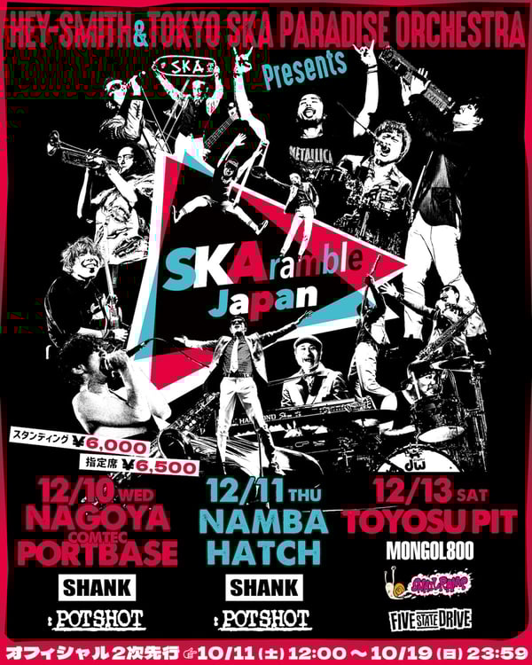 HEY-SMITHと東京スカパラダイスオーケストラが12月に開催するライブイベント「SKAramble Japan」にSHANK、MONGOL800、POTSHOT、SNAIL RAMP、FIVE STATE DRIVEが出演する。