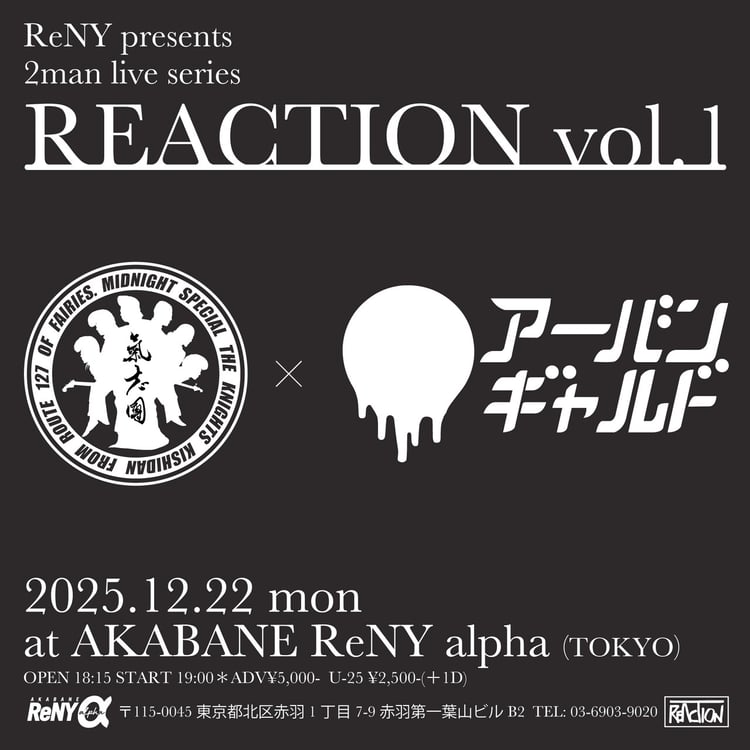 「2man live series REACTION」は、ライブハウスReNYによる新企画。初回は氣志團とアーバンギャルドがツーマンライブを繰り広げる。各アーティストのオフィシャルサイトでは明日10月14日12:00よりチケットの先行予約を受け付ける。11月5日0:00にはチケットの一般販売がスタートし、25歳未満を対象としたU-25割チケットも発売される。