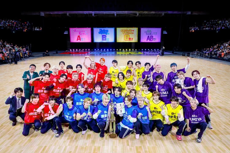 A型チームの中村旺太郎(ICEx)が「急遽8人になったんですが、覚醒していきたいと思います!」と、AB型チームのシューヤが「世界の30歳に希望を持たせます!」と宣言し、リレーはスタート。4チームのデッドヒートが繰り広げられる中、O型チームのアンカー、千田波空斗(ICEx)がA型チームの池田彪馬(SUPER★DRAGON)の追い上げをかわす形で1位のゴールテープを切った。最終的に1位がO型チーム、2位がB型チーム、3位がAB型チーム、4位がA型チームという結果に。O型チームのリーダー、曽野は優勝を確信したのか「今日、最高っすね! イイじゃん!」と最高の笑顔を見せる。また、3位のAB型チームのマサヒロは「俺のマイメン(シューヤ)がバトンを落としたんですけど、絶対抜いてやろうと思ってガチで走りました!」と熱くコメント。するとシューヤは「NINE LIVES」の歌詞に掛けて「爪研ぎすぎて滑っちゃいました」と話し、会場を沸かせた。