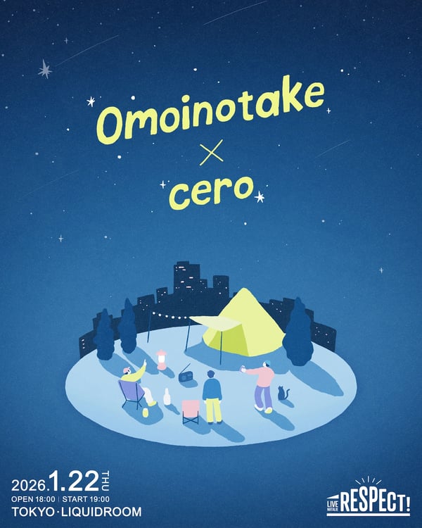 これは“尊敬するアーティストとの共演”をテーマに掲げるライブナタリーのライブシリーズ「RESPECT!」の新規公演として行われるもの。「2026年3月に控えている東京・日本武道館ワンマンに向け、メンバーもファンも気持ちをさらに高められる場を設けたい」という思いのもと、ライブナタリーがOmoinotakeにオファーし、Omoinotakeは競演したいアーティストとして以前より音楽ルーツとして公言していたceroの名を挙げた。