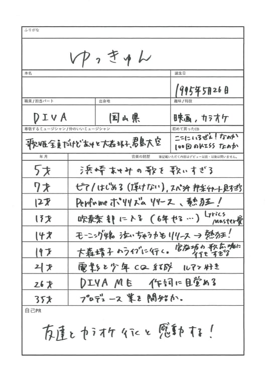 1行余ったので「35才 プロデュース業を開始か」という未来のことも履歴書に書いておきました(笑)。自分はまだ作詞を始めて数年だけど、J-POPの歌詞にもっとよくなってほしいし、小出祐介(Base Ball Bear)さんにそう命じられているんですよ。「ゆっきゅんはたくさん作詞をして影響を与えて、J-POPの歌詞のクオリティを底上げする存在です。任せました」って。それは激励として大げさに言ってくださっているのはわかっているんですけど、35歳になったときにゆっきゅんがグループを作るとなったら、本気の人がたくさん集まるようにしておかなきゃいけないので、そのために今はもっともっと売れたいです。すでに好きでいてくれてる人はもちろんですけど、もっとたくさんの人にゆっきゅんを広げていかなきゃいけない。それに、男の子が歌える感情のバリエーションが少ないと感じていて、もっといろんな表現があっていいと思うんです。2030年くらいには、ゲームチェンジャーが現れるはずなので期待していてください。