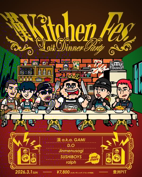 3月に終了する「漢 Kitchen」。「Last Dinner Party」と題したイベントでは、これまで番組に出演したアーティストのライブを“最後の晩餐”として届ける。出演アーティスト第1弾として、番組MCの漢 a.k.a. GAMIに加えて、ゲスト出演したD.O、Jinmenusagi、SUSHIBOYS、ralphの出演が決定。チケットぴあではチケットの先行予約を受け付けている。