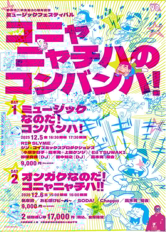 「コニャニャチハのコンバンハ!」には赤塚の作品から影響を受け、そのスピリッツに共感するミュージシャンが集結。初日の「ミュージックなのだ! コンバンハ!」にはRIP SLYME、シン・コイズミックスプロダクションズ(小泉今日子+高木完+上田ケンジ)、Ed TSUWAKI、砂原良徳、田中知之(FPM)が出演する。このうちEd TSUWAKIはシン・コイズミックスプロダクションズのパフォーマンスに参加する。2日目「オンガクなのだ! コニャニャチハ!」には氣志團、おとぼけビ~バ~、SODA!、Chappoが登場。両日の司会は高木が担当する。チケットは明日11月8日10:00から各プレイガイドにて販売がスタートする。