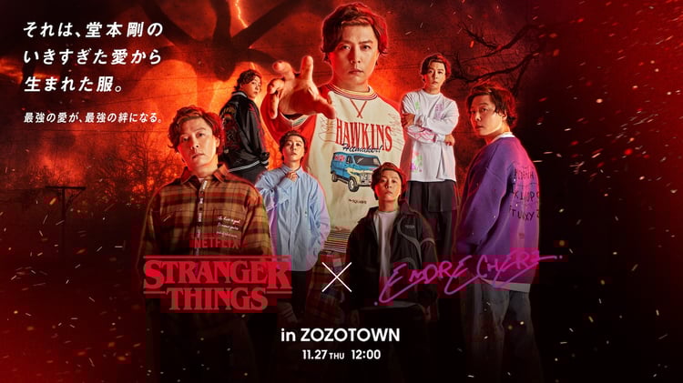 堂本剛とNetflixシリーズ「ストレンジャー・シングス」のコラボアイテムシリーズ「STRANGER THINGS × .ENDRECHERI. in ZOZOTOWN」が11月27日よりZOZOTOWN限定で受注販売される。全23型のアイテムラインナップが発表された。