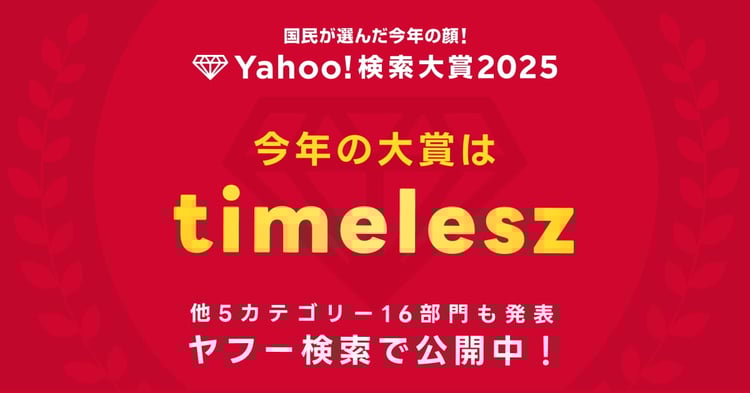 LINEヤフー株式会社は、2025年に前年と比べて検索数が急上昇した人物や作品、商品、お出かけスポットをランキング形式などで発表する「Yahoo!検索大賞2025」を本日12月3日に公開。集計の結果、timeleszが「大賞」と「ミュージシャン部門」1位を初受賞した。