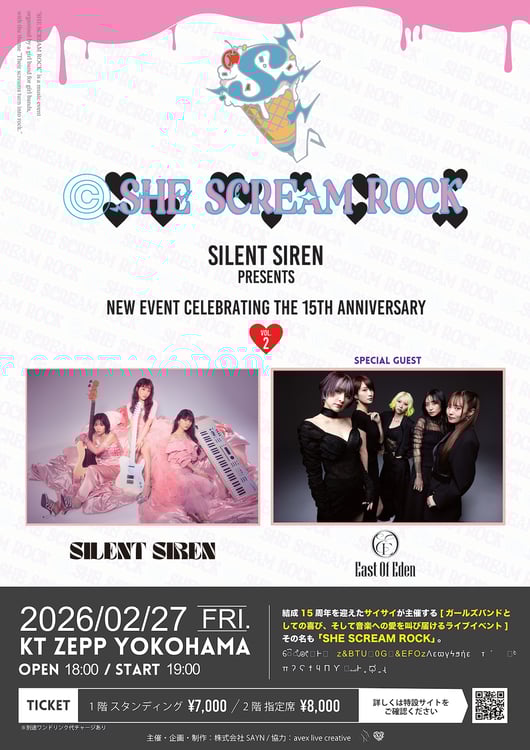 「SHE SCREAM ROCK」は、今年結成15周年を迎えたサイサイが「今まさに夢を追う人、音楽を始めたいと願う誰かにとっての背中を押すきっかけになれたら」という願いを持って新たに立ち上げたライブシリーズ。今回はSILENT SIRENとEast Of Edenによる対バンが行われる。