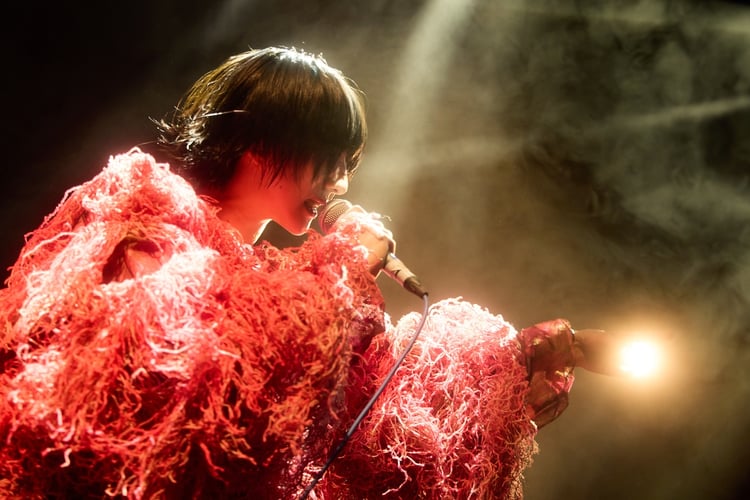 そんな中で開催されたライブは、“孵化することと孵化させることが同時に意味される造語”を冠した最新アルバムと深くリンク。WWWに足を踏み入れた来場者を出迎えたのはアルバムジャケットを飾ったピンクの胎児だ。レーベルの立ち上げ時に「よりDIYかつアナーキーな活動というものを実践していきたい」と春が語っていた通り、このオブジェはマネージャーの港土とともにDIYで制作されたものだという。ライブへの並々ならぬ気合いをステージセットから観客が感じ取る中、春の言葉が聞こえてくる。