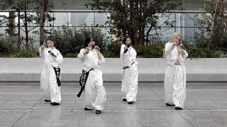 KISS OF LIFEのサプライズライブは、TAKANAWA Gateway Parkで行われていたK-POPランダムプレイダンスの一環として突然スタート。将来有望な若手ダンサーたちによるパフォーマンスが繰り広げられている中、白い上下のジャージにサングラスをかけたJULIE、NATTY、BELLE、HANEULが現れると、驚き混じりの歓声があちこちで沸き起こった。ライブが始まった15:00台は、吐く息が白くなるほどの寒さではあったが、メンバーはキレのある動きで「Igloo」をパフォーマンス。曲の終盤ではサングラスを外し、目の前の観客に笑いかける場面も。トークパートでは「寒い?」「大丈夫?」と観客を気遣い、ダンス中とは異なる人懐っこい一面をのぞかせた。