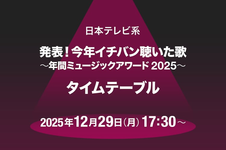 明日12月29日17:30より約5時間半にわたって生放送される、日本テレビ系の音楽特番「発表!今年イチバン聴いた歌~年間ミュージックアワード2025~」のタイムテーブルが発表された。