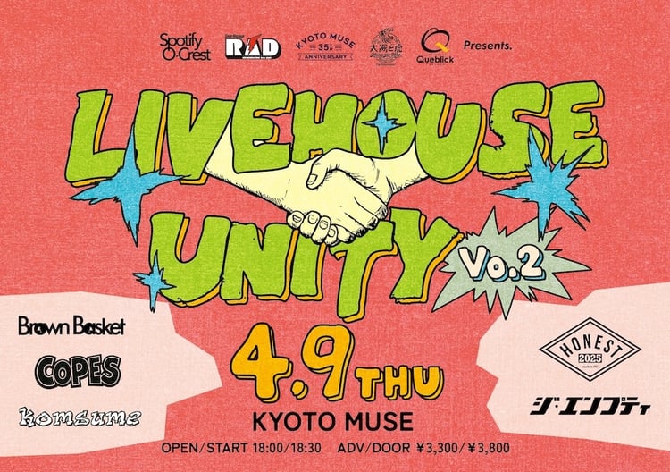 東京、名古屋、京都、神戸、福岡のライブハウス5店舗による共同企画「LIVEHOUSE UNITY vol.2」が、4月9日に京都・KYOTO MUSEで開催されることが決定した。