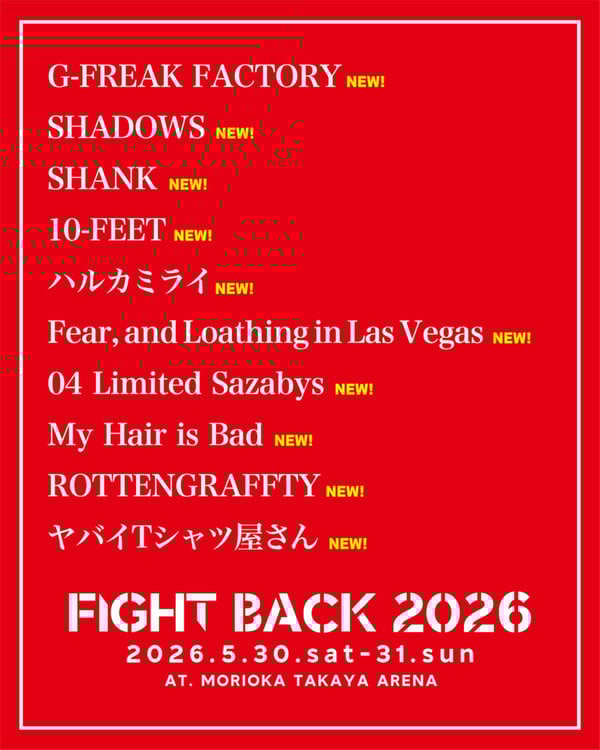 「FIGHT BACK 2026」は岩手のライブハウス・盛岡Club Changeが主催するイベントで、今回で4回目の開催となる。出演アーティスト第1弾として、G-FREAK FACTORY、SHADOWS、SHANK、10-FEET、ハルカミライ、Fear, and Loathing in Las Vegas、04 Limited Sazabys、My Hair is Bad、ヤバイTシャツ屋さん、ROTTENGRAFFTYの10組が発表された。