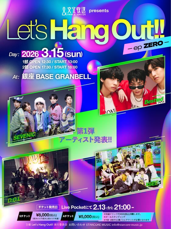 ボーイズグループが競演する新たな対バンイベント「文化放送 presents『Let's Hang Out!! -ep ZERO-』」が3月15日に東京・BASE GRANBELLで開催される。