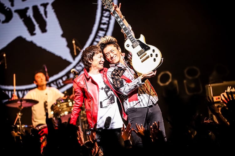 3曲を歌い終えた宮田は「皆さんおひさしぶりです、ジェット機です!」と挨拶し、メンバーを紹介。そして「今日は60歳のお祝いということで。このあと世界的バンドのJUN SKY WALKER(S)も出てきますが(笑)、まずはジェット機タイムを楽しんでください」と観客に呼びかけた。その後も4人は「PEKINGESE」「My world」など、ジェット機の軌跡を飾った懐かしのナンバーを連投。宮田がakkinや野田と肩を組む姿に、フロアからは大歓声が起こった。