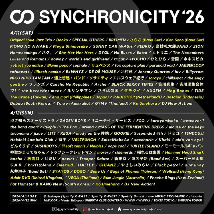 4月11、12日に東京・渋谷で開催される都市型フェスティバル「SYNCHRONICITY'26」の最終ラインナップが発表された。