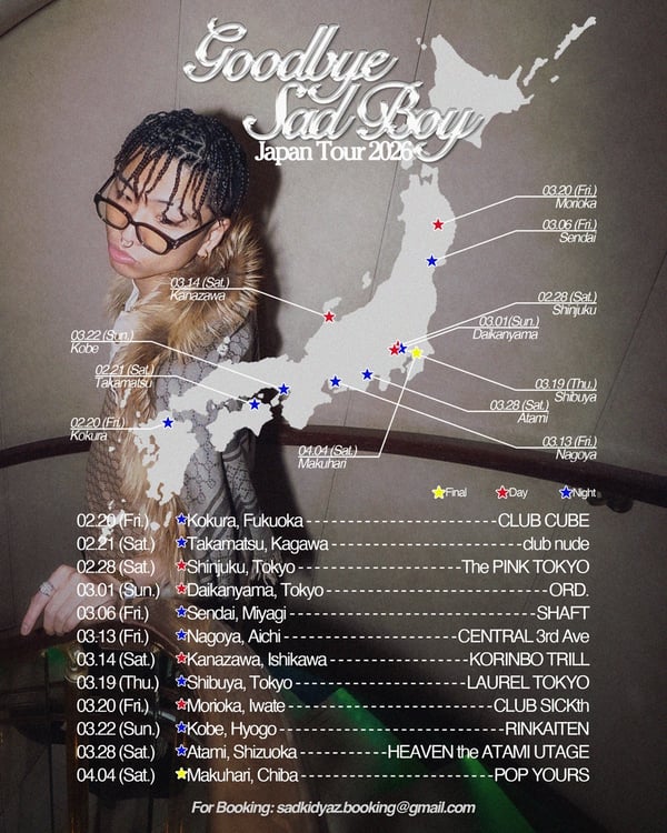 本日2月18日に3rdアルバム「Goodbye Sad Boy」をリリースしたSad Kid Yaz。ツアーは2月20日に福岡でスタートし、4月4日に千葉・幕張メッセ国際展示場1~6ホールで開催されるヒップホップフェスティバル「POP YOURS 2026」がファイナルとなる。