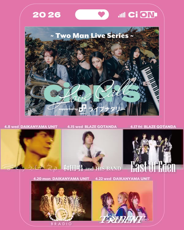 「CiON’s Love Call」は、CiONが共演したいアーティストを招くライブシリーズ。今回は4月8日にUNIT、15日と17日にBLAZE GOTANDA、20日と22日にUNITで開催される。