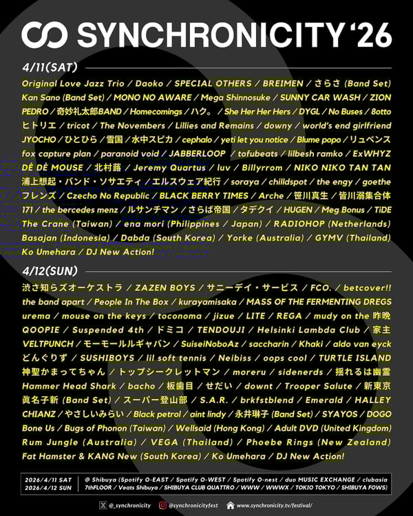 1日目にヒトリエ、MONO NO AWARE、SPECIAL OTHERS、BREIMENらをはじめとする73組、2日目にbetcover!!、LITE、kurayamisaka、ZAZEN BOYSら69組が出演する「SYNCHRONICITY'26」。1日目はOriginal Love Jazz Trio、2日目は渋さ知らズオーケストラが東京・Spotify O-EASTで各日のライブアクトのトリを務める。チケットはチケットぴあにて販売中。