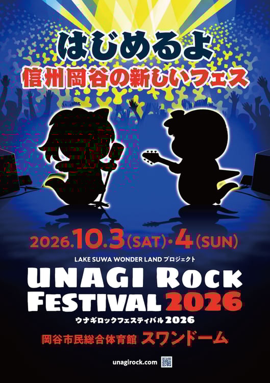 10月3日と4日に長野・長野県岡谷市スポーツ施設 西体育館(スワンドーム)にてロックフェスティバル「UNAGI ROCK FESTIVAL 2026」が開催される。
