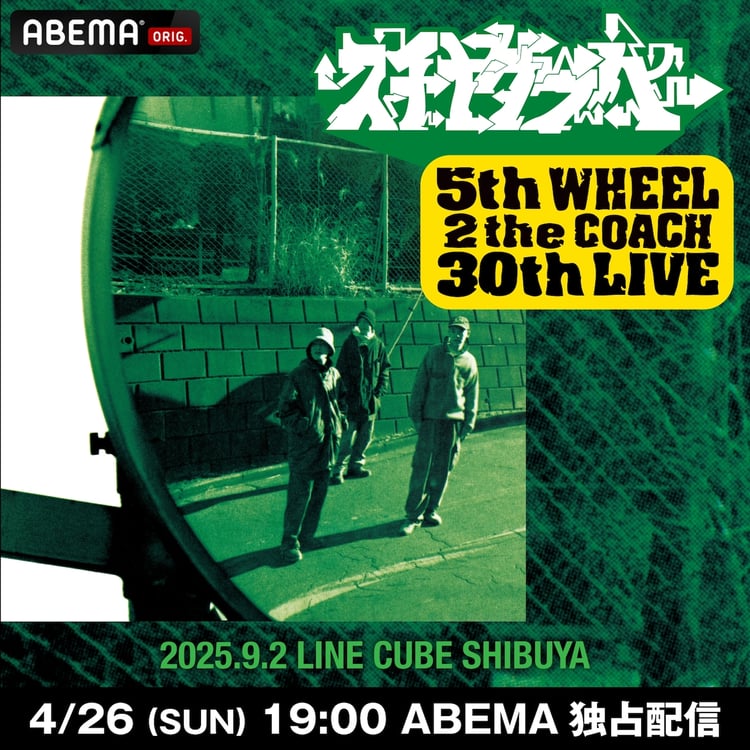 スチャダラパーが2025年9月に東京・LINE CUBE SHIBUYA(渋谷公会堂)で開催したアルバム「5th WHEEL 2 the COACH」の30周年記念ライブ「5th WHEEL 2 the COACH 30th LIVE」の模様が、アルバムの31周年記念日となる4月26日にABEMA HIPHOPchで配信される。